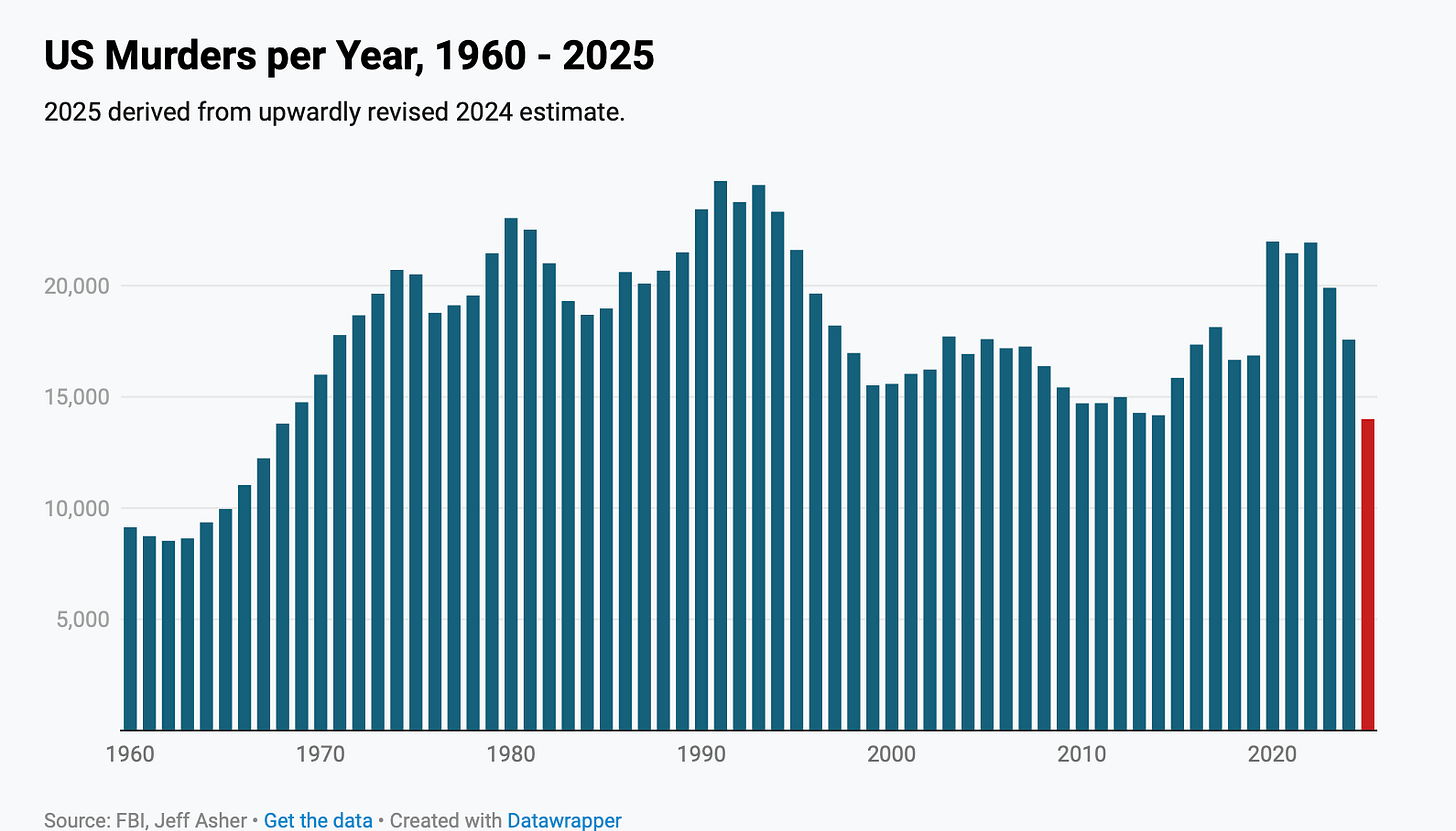 3. Multiple methods converge on the estimate that there were around 14,000 murders in the US in 2025. That is the lowest absolute number since 1968. The negativity bias in the news is incredible to ponder. You have to go to highly specialized Substacks to find this information, while every uptick in crime is a huge national story. Murder plummets and there’s zero interest in what we’re doing right. Perhaps at some point it goes up again, and we’ll be less prepared to deal with the problem because we put forward practically no effort toward figuring out what happened when things were going well.