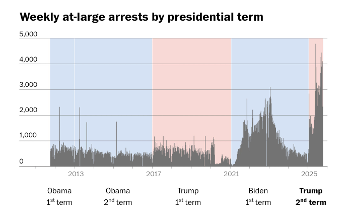 All of this is happening not due to public pressure, but because Stephen Miller has demanded 3,000 arrests a day. Although ICE hasn’t reached those numbers, at-large arrests are about two and a half times higher than they were under Biden.