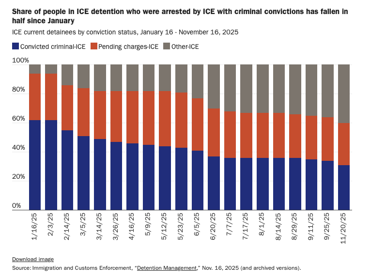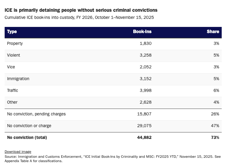 Propaganda from the administration focuses overwhelmingly on criminals it has picked up. But there aren’t nearly enough miscreant aliens for them to get the numbers they want. That is why between early October and mid-November, 47% of those booked into ICE detention did not have a criminal conviction or even a pending charge. Only 5% had been convicted of a violent crime.