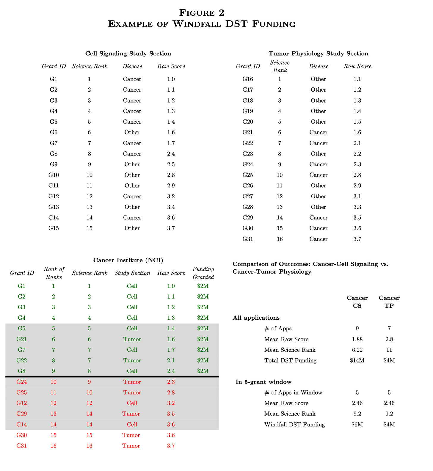 When applications are received by a study section, they get a raw score between 1.0 and 5.0, with 1 being the best. Raw scores are normalized within a study section and converted to a percentile, which are considered a “science rank.” Once this happens, the relevant IC funds applications in rank order, where ranking is determined by comparing science ranks across applications within the same body system or disease area. In this way two applications can have the same raw score for scientific merit, but one might get funded while the other doesn’t. Likewise, two DSTs might have similar scientific potential while one gets more funding than the other. As the output variable, Azoulay et al. looked at biomedical innovation as measured by patents and the papers that they reference, which in turn reference grants. The authors' main innovation is to use grants that fall just above the funding threshold (a “windfall”) within each IC's payline window as an instrument for DST funding, while controlling for raw score and science rank. Here’s a figure showing how it works.