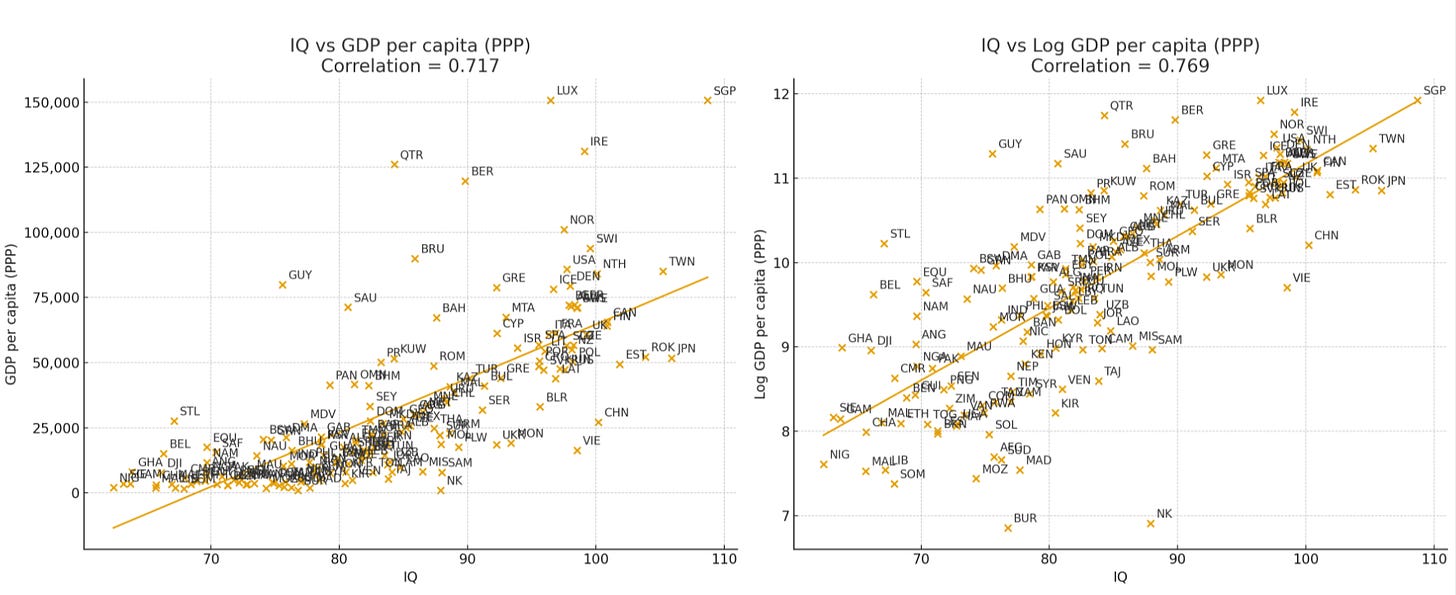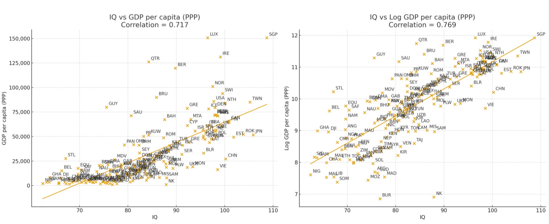 Just for fun, let’s use the Parra and Kirkegaard IQ scores for the same analysis, and see how they correlate with wealth. The CIA World Factbook gives North Korea a real GDP of $600 in 2023. I’ll take into account uncertainty, be generous and prop them up to $1,000. I also relied on the CIA World Factbook for the economic data for Venezuela. In the graphic below, I made a chart that uses unadjusted real GDP per capita and another that has that number logged, since among the poor countries near the bottom they all clump together.