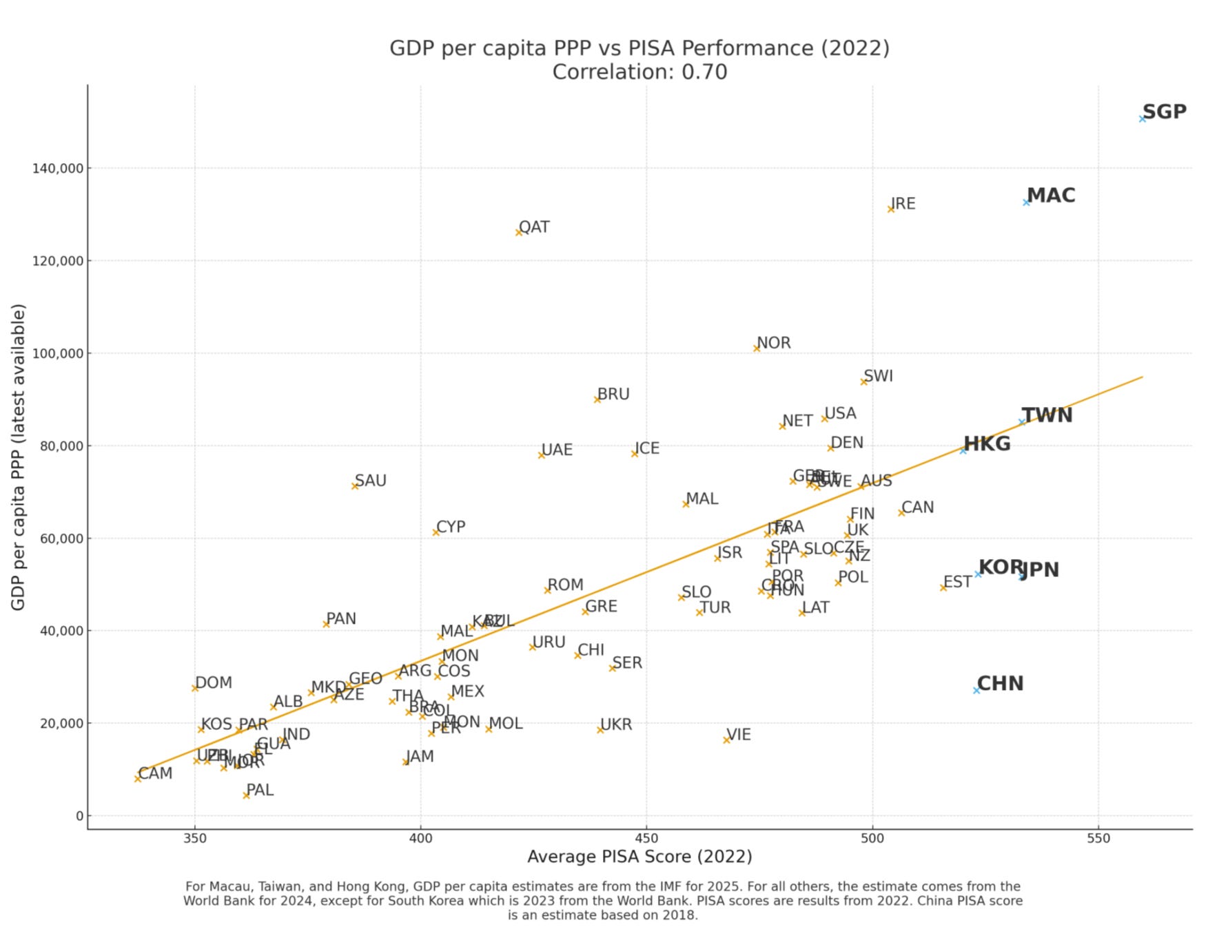 Note that the PISA score for China is an estimate. In 2022, data from China wasn’t collected due to Covid restrictions. So I started from the average score in 2018, when it had the best performance in the world. I had to make an adjustment, since for China the students were drawn from the urban centers of Beijing, Shanghai, Jiangsu, and Zhejiang (B-S-J-Z). I assumed that Chinese students in those locations were one standard deviation over the national norm, with the standard deviation calculated from the sample of cross country scores. I think this is beyond reasonable. B-S-J-Z has a combined population of nearly 200 million! If they were their own country, they would be the fourth largest nation participating in PISA. A one standard deviation adjustment is probably way too much, corresponding roughly to the gap in test scores between the highest and lowest performing American states. But even with that adjustment, China still comes out as a very smart country that has not done that well economically.