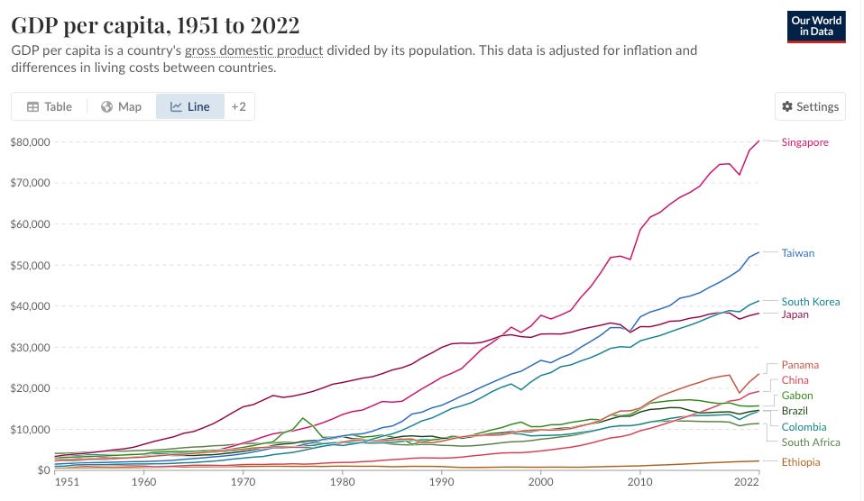 As of 1950, Taiwan, South Korea, and China were all poorer than Brazil, Panama, and Gabon. Japan and Singapore were a little better off, but still behind Colombia and South Africa. Since that time, East Asia has blown past other non-Western countries. China got a late start here, only beginning to see real growth in the 1980s, but the takeoff has been rapid, and it looks to be headed toward the living standards of its neighbors, though this is complicated by the fact that its birthrate has collapsed while it is still a middle-income country.