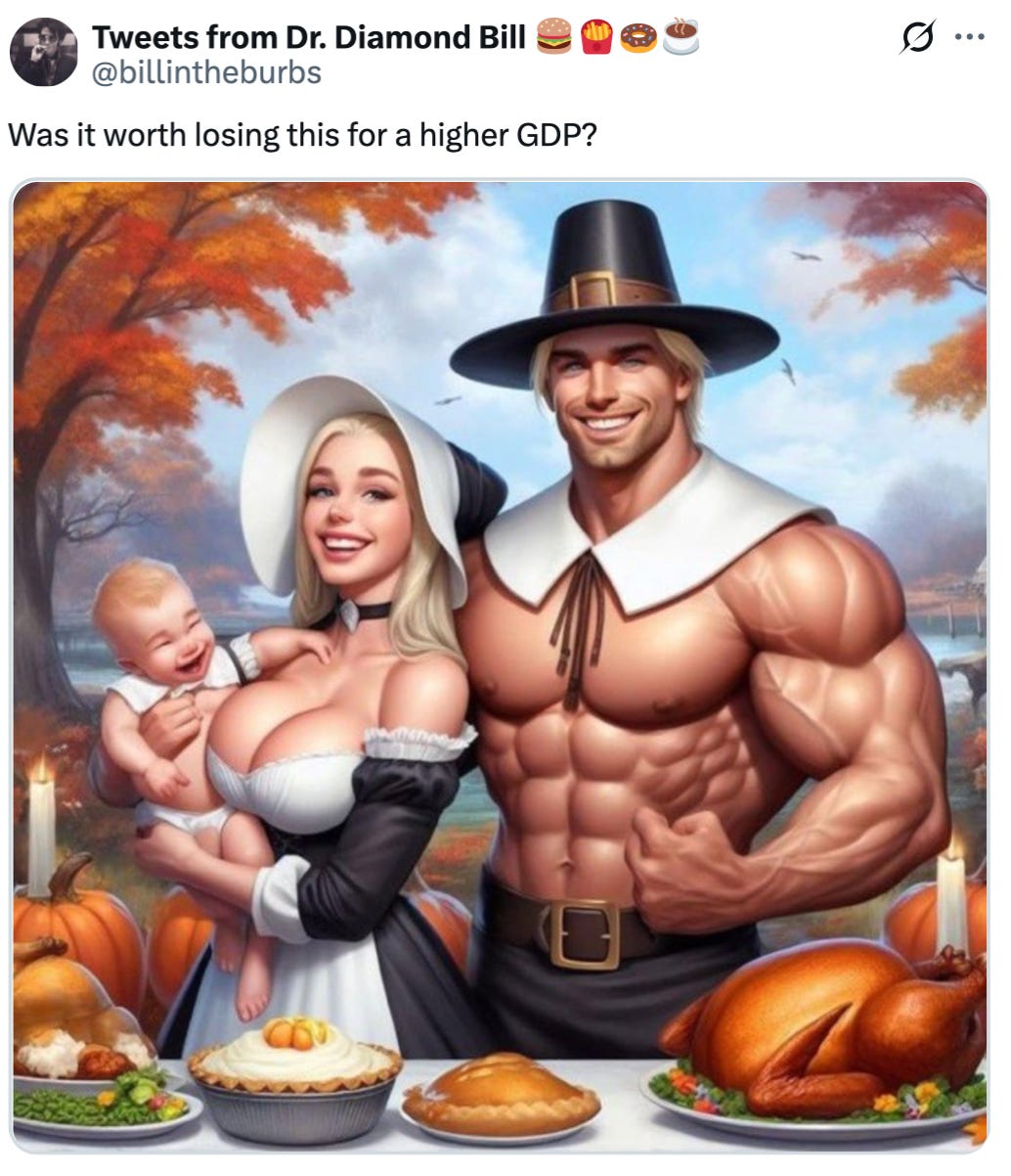 This is the dilemma of modernity. Life is too easy relative to any other point of our history. This has combined with the rise of smart phones and social media to make many people miserable. They develop illiberal political views in response. Fall into an internet rabbithole, and you can just deny reality and pretend like life actually is hard and there is an oppressive force worth struggling against, because you suffer from structural racism, transphobia, population replacement, or the never-ending lies of the “Cathedral.” You see it in memes about how pleasant life on one salary was in the 1950s, with a reminder to “never forget what they took from you.” A lot of this stuff is pathetic and self-pitying, if not downright pathological, but there’s also a payoff in that it has all the elements of what makes a good story: a desired end state, high-stakes, comrades-in-arms, moral certainty, and a clear enemy.
