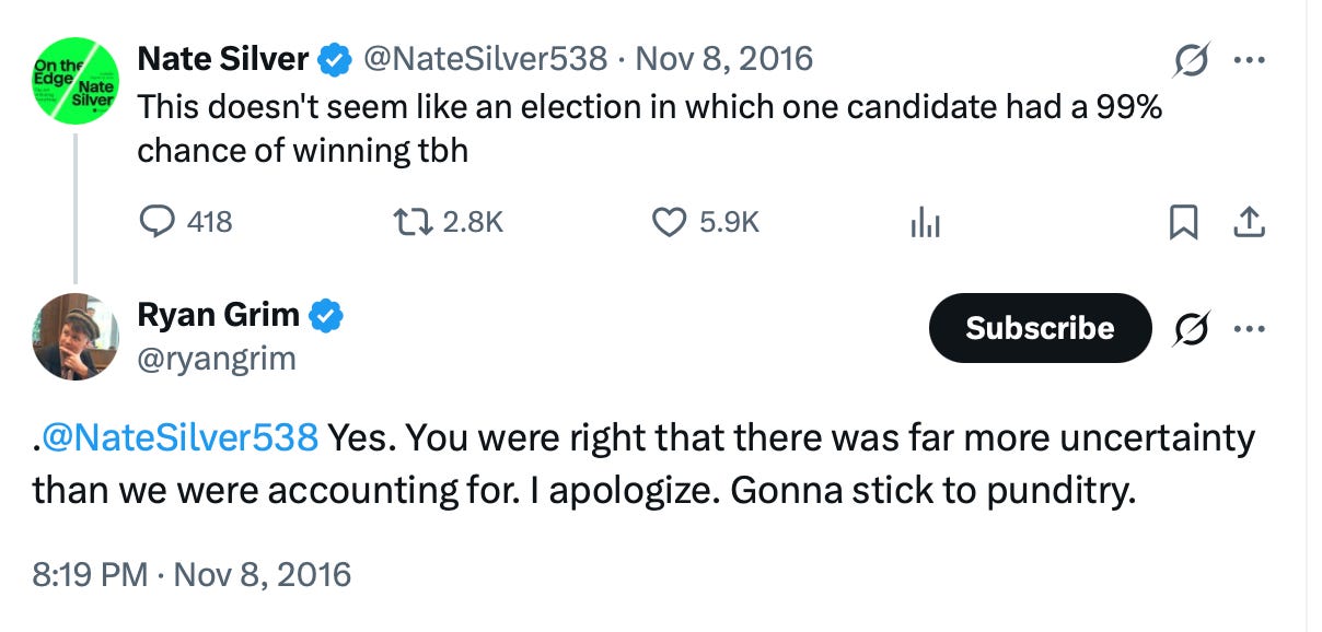 The night of the 2016 election, something remarkable happened. After having attacked Silver during the campaign, Ryan Grim of the Huffington Post admitted defeat. He tweeted to Silver, “Yes. You were right that there was far more uncertainty than we were accounting for. I apologize. Gonna stick to punditry.”