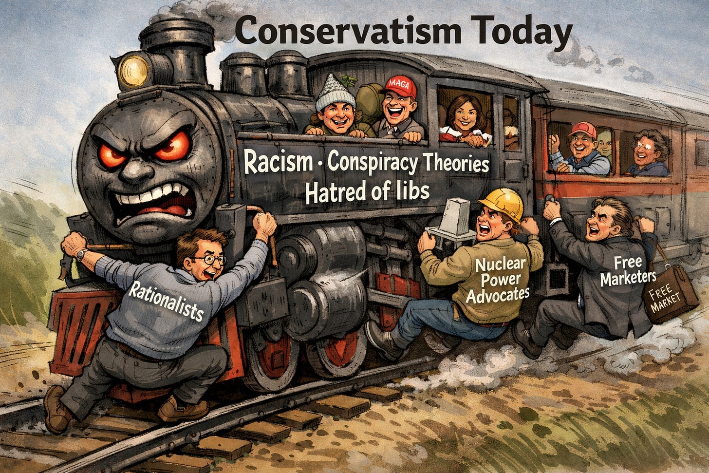All of this shows that one major faction in politics being completely taken over by low human capital can have advantages for smart people who want to do great things. Picture the following image: a train with an angry face and the engine saying “Racism, Conspiracy theories, Hatred of libs.” All these maniacs are sitting comfortably in their seats. But holding on for dear life off the sides are people labeled “Rationalists,” “Nuclear power advocates,” and “Free marketers.” I’m no cartoonist, but I asked ChatGPT to draw this, and here’s what I got.