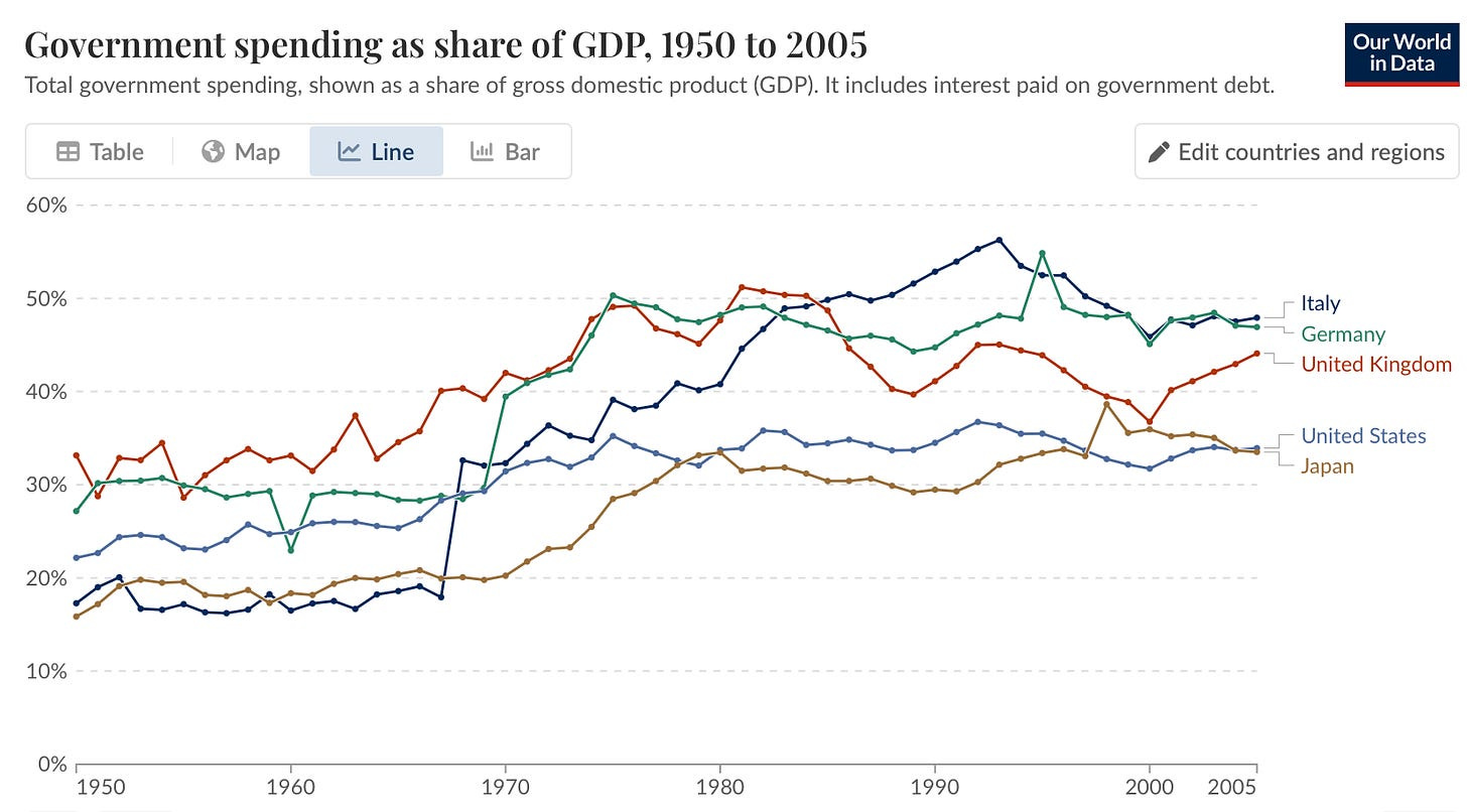 The lesson here is that systems inevitably build on what came before. When there was a consensus in favor of big government from the 1940s to the early 1970s, developed nations were starting out from very low levels of spending and intervention in the economy. They expanded the size and scope of government over the next few decades, until crises started to hit in the late 1970s and it was clear that there needed to be a new path forward. Ronald Reagan believed more in free markets than did LBJ. Nonetheless, Reagan left behind a much larger and more expansive federal government than Johnson did, despite their ideological differences. That just goes to show how leaders in democratic countries do not remake their societies from scratch. As a wise woman once said, you did not fall out of a coconut tree.