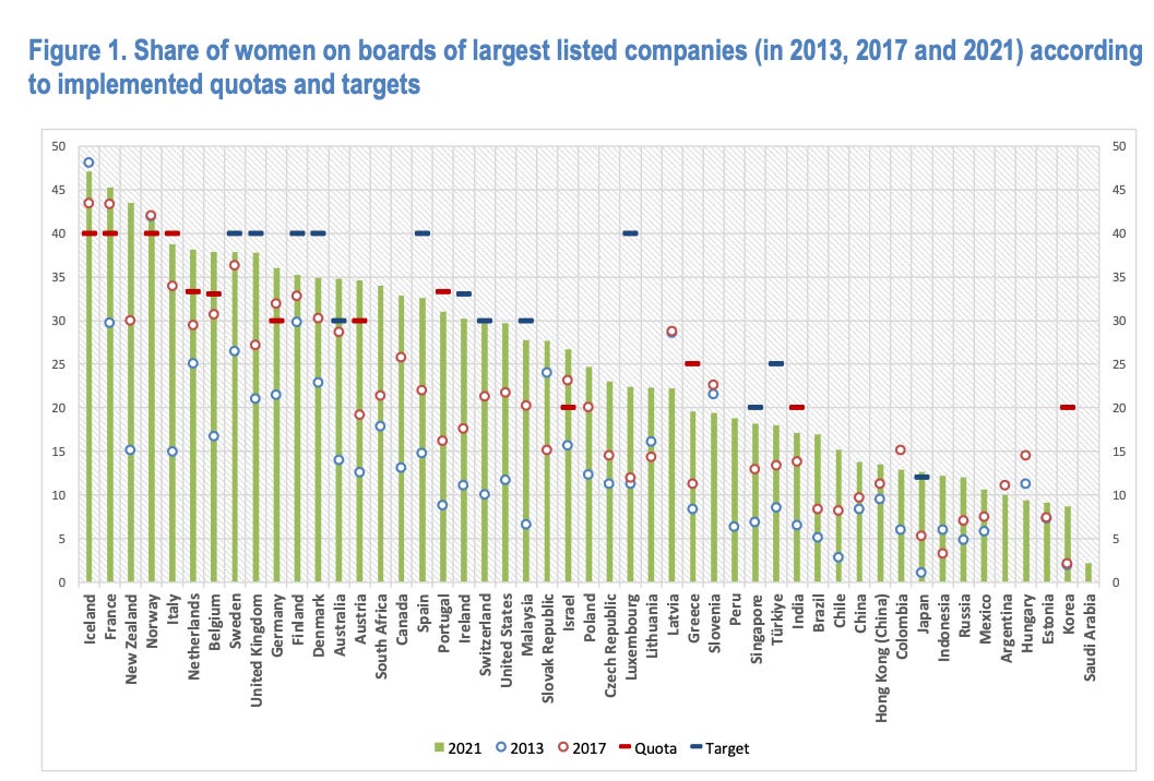 In terms of pure results, Korea is far from a feminist paradise, probably reflecting the state of the law. Its gender equity measures remain weak relative to practically all Western nations. It has the largest gender pay gap in the OECD, with women earning 31% less than men — nearly triple the average of around 11%. The Korean parliament is 19.1% female, putting it 39th out of 42 OECD countries. As of 2021, it comes in second to last place in women on corporate boards in a comparison of 49 middle- and high-income countries, only beating Saudi Arabia.