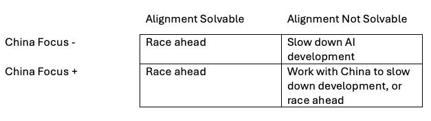 If alignment is not immediately solvable, then perhaps what we should do is slow this train down. In a world where China won’t care or think about AI, this is something we can undertake ourselves. The scariest world is in the bottom right. It would require careful thought about whether some kind of arrangement with the CCP is possible. If not, then we are off to the races to at best be the first ones to develop a likely unaligned AI. China might win, and even if we “win,” that may doom humanity anyway.